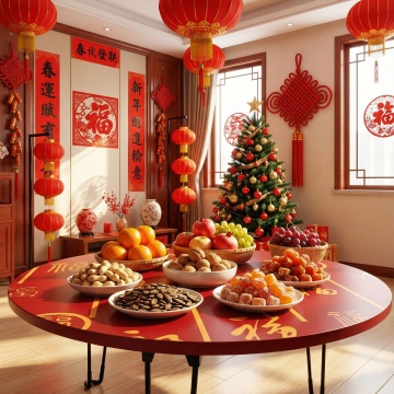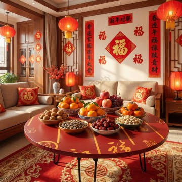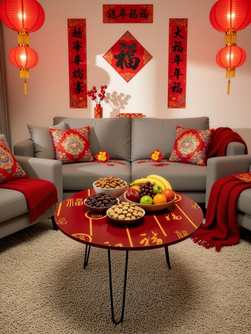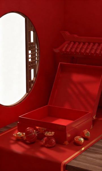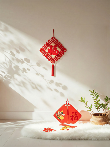主体:短绒印花红包(毛绒龙纹 + 烫金 “喜” 字,鼓起立体);点缀:红绒小托盘(衬布毛绒),周围摆 1 个迷你毛绒宫灯、2 片毛绒红果;甜品:1 块迷你毛绒山楂糕(白绒糖霜 + 小毛绒红果点缀),放红包侧方;场景:背景是简约毛绒门框(仅边框裹绒),暖光主照主体,绒面质感突出,点缀元素简约和谐