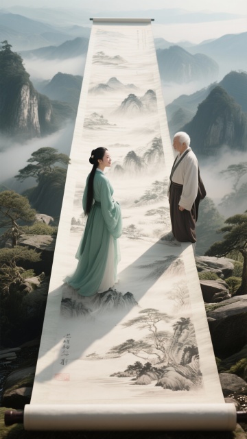 古典中式工笔风,水墨山水背景,超现实主义手法展现师徒对话,意境深远。