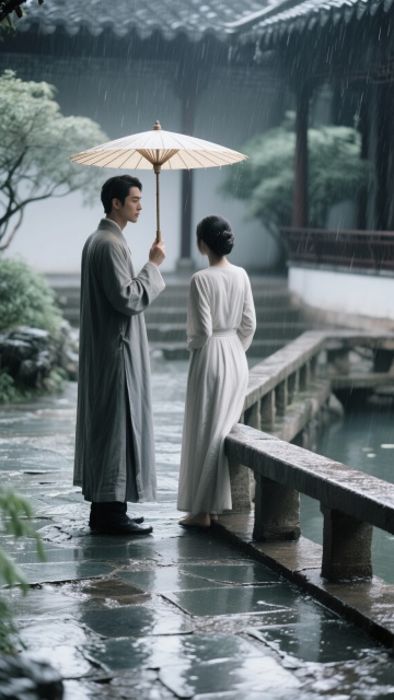 古典中式工笔风,水墨渲染,女子雨中持伞,静谧优雅,莲池锦鲤,唯美感十足。
