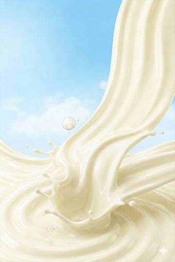 高写实主义3D渲染,白色纯净背景,一个呈优雅弧形飞溅的牛奶液体,具有半透明乳白质感和细腻光泽,液体边缘清晰锐利,内部有微小气泡和流动纹理,底部滴落着大小不一的奶滴,周围散布着轻盈的细小奶雾颗粒,整体光影效果为柔和的顶光照射,高光区域明亮且过渡自然,阴影细腻柔和,保持与原图一致的动态捕捉和立体感,展现液体飞溅瞬间的真实物理形态与质感。
