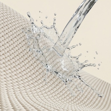 白色背景下,三层不同结构的透明材质叠层设计,最上层为带有细密六边形孔洞的平面层,中间层呈现波浪状起伏并同样布满小孔,底层是规则排列的半球形凸起结构,三个向上的蓝色箭头从叠层中心位置发出,整体采用科技感的蓝白渐变色调,光影柔和,具有清晰的结构层次感和半透明质感,展现产品的透气性与支撑性,设计风格简洁现代,偏向功能性产品的技术展示图。