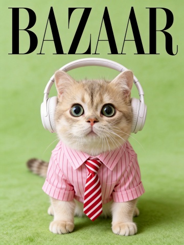 拟人风猫咪身着条纹衬衫与红白领带,佩戴耳机,梦幻紫瞳与毛发生长细节展现可爱感,杂志风封面设计融合时尚感与动漫元素。