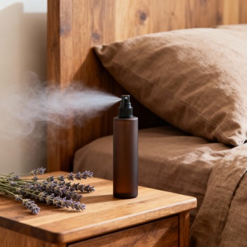 一个透明玻璃材质的棕色精油瓶,配有深色木质瓶盖,瓶身简约无过多装饰,放置在铺满干燥薰衣草花穗的浅色石台上,周围散落着几片完整的薰衣草叶片和几颗饱满的薰衣草花苞,背景是柔和虚化的淡紫色薰衣草花田,清晨的阳光透过薄雾洒下,在瓶身和花穗上形成细腻的光斑和柔和的阴影,水面倒映着瓶身和花穗的轮廓,整体画面呈现出宁静自然的氛围,光影柔和,色彩以紫色和淡绿色为主,质感细腻,细节清晰。
