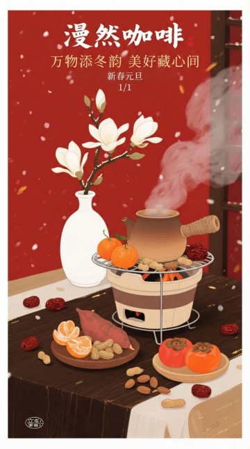 冬至夜雪落庭院,水墨笔触勾勒“冬至”大字,红灯笼映暖光,家人围坐包饺子,剪纸窗花透温情,国潮风韵中尽显中式复古与喜庆温馨。