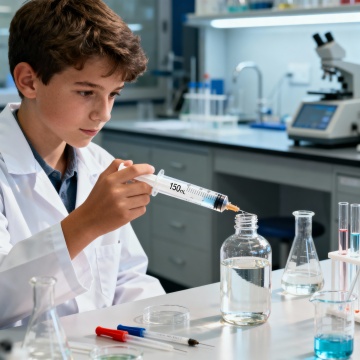 俯视角构图,极简主义实验室工作台面中央,一只戴着无菌白色丁腈手套的手正以毫米级精度操控着一支尖端极细的石英微量移液器,透明的液体弯月面在吸头末端形成完美的半球体,正悬停在一支刻有金色刻度线的硼硅酸盐玻璃试管正上方2毫米处,试管内装有三分之二体积的淡蓝色荧光溶液,底部沉淀着细密如星尘的白色颗粒,周围环绕着五只排列成正六边形的相同试管,每只试管内液体呈现出从浅蓝到靛蓝的渐变层次,背景是被柔和白光均匀照亮的浅灰色环氧树脂台面,左侧放置着一个带有蓝色LED指示灯的小型离心机,右侧是半开的磨砂玻璃试剂瓶,整个画面采用高对比度的蓝白灰三色系统,8K超高清分辨率捕捉到手套纹理和液体表面张力的微妙变化,浅景深使所有元素聚焦于移液动作的黄金分割点,营造出冷静、精准、近乎仪式感的科学美学。