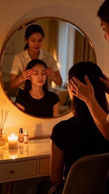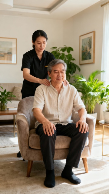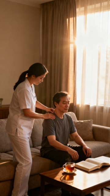 温暖柔和的自然光透过竹帘洒入,营造出宁静舒适的氛围。一位专业的按摩师正手持白色陶瓷小壶,将金黄色的按摩精油缓缓滴落在顾客的背部。顾客趴在铺着洁白毛巾的按摩床上,背部肌肤在阳光下泛着健康的光泽。背景是简约雅致的木质装饰和绿色植物,整体环境充满自然、放松的感觉,光线柔和温暖,突出精油滴落的瞬间和肌肤的质感,营造出高端SPA的舒适体验。