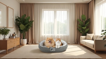 软3D风格呈现温馨可爱的宠物互动场景,拟人化猫咪与柴犬共享玩具,阳光洒满客厅,传递生活美学的治愈感。