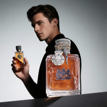 优雅奢华的香水瓶置于木雕风底座,搭配柔和插画风花卉,简约主义设计,尽显高贵。