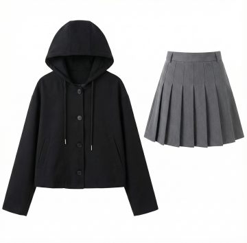 提取出图片中的上身外套和下身短裙,整体正面,变新,商业拍摄,有立体感,外套和短裤分开,白色背景