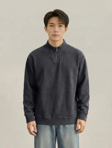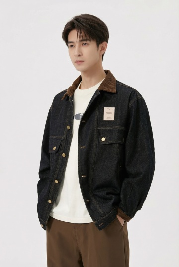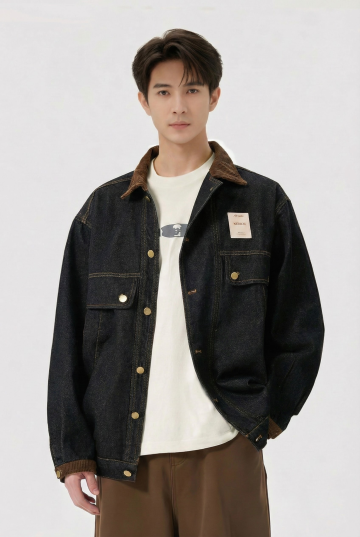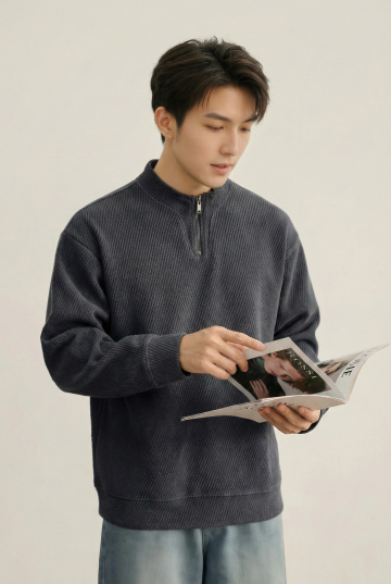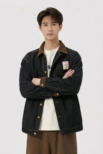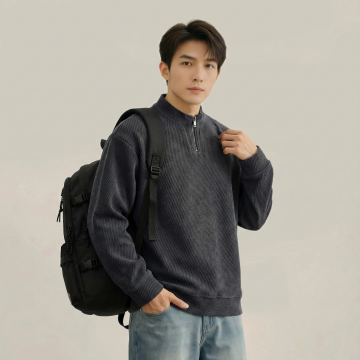 全身中景,年轻男性身着炭黑色高领针织衫(外搭灰蓝色牛仔夹克,袖口随意卷起露出白色条纹T恤边),搭配深军绿色多口袋工装直筒裤,裤脚部分微收露出黑白棋盘格帆布鞋,左手自然下垂握着半开的黑色帆布背包带,右手插在裤袋中,身体重心偏向一侧形成自然S形曲线,嘴角带着若有若无的微笑。整体为高清晰度的商业服装摄影风格,简约干净的浅灰色纯色背景,45度侧前方柔光光源,在地面形成柔和渐变阴影,突出牛仔面料的做旧纹理与针织衫的细腻质感,人物站姿兼具随性与利落,展现都市休闲的层次感穿搭效果。