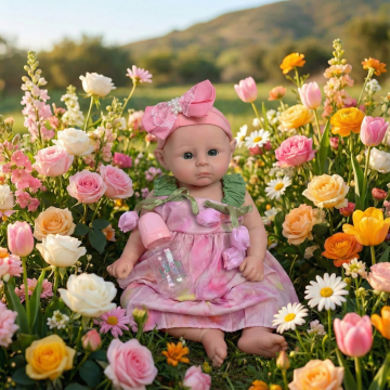 微型仿真娃娃坐在草地上,周围是黄色的小花朵