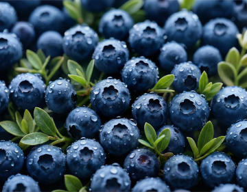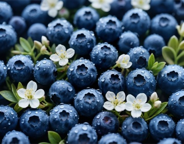 三颗饱满圆润的蓝莓,表面覆盖着晶莹剔透的水珠,呈现出深邃的靛蓝色,带有自然的果霜质感。蓝莓顶部的果蒂呈深褐色,微微开裂。蓝莓下方衬托着几片鲜绿的椭圆形叶子,叶脉清晰可见,叶片边缘光滑。整体构图简洁,主体突出,采用高清晰度的写实摄影风格,光线明亮柔和,水珠反光细腻,背景为纯白色,营造出清新、新鲜、水润的视觉效果,完美展现蓝莓的天然色泽与质感。