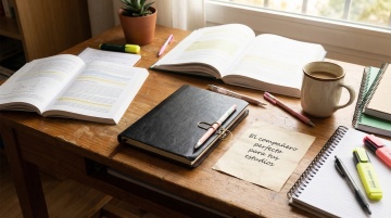 现代简约风格,科技感十足的办公桌,手账风笔记本与耳机点缀,营造舒适学习氛围。