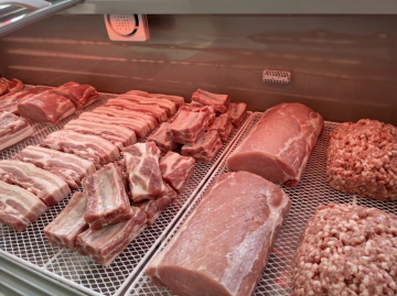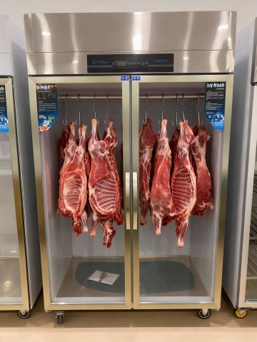 文字去除,冰箱第一层为蔬菜,第二次为水果,第三次为肉类。手上拿的三文鱼替换成牛排