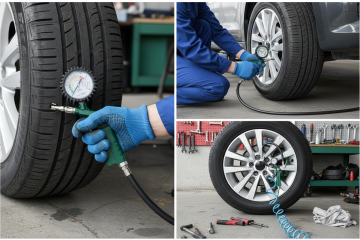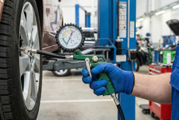 专业产品展示摄影风格,1:1正方形构图,画面中央成年人手握着黑色塑料材质便携式电动打气泵,顶部黑色金属气管连接塑料气嘴,背景黑色自行车轮胎特写,轮胎纹理质感,产品顶部LED灯光锥形照射轮胎表面形成光斑阴影,专业摄影棚照明,中心构图法,黑色黄色红色主色调,LED白色光束,高清晰度渲染,细节丰富质感真实,现代科技产品专业展示氛围。