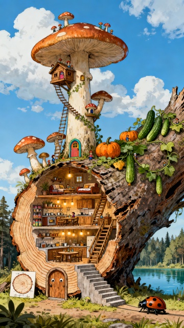 在茂密森林深处,一座由蘑菇与藤蔓搭建的童话书屋,书本从窗户飘出化作会飞的书页精灵,小鹿趴在屋前翻看绘本,阳光透过树叶洒下光斑,水彩插画风格,色彩清新柔和,突出奇幻治愈氛围