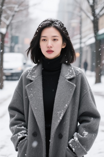 生成4张2:3比例照片,保持人物长相百分之百不变,人物动作、取景和角度丰富(取景涵盖半身、全身、脸部近景、脸部特写)。 风格:日系富士胶片风的人像写真,采用富士NC胶片滤镜,冷色调。 场景:冬天晴天下午时刻的大海边,有沙滩,有一点礁石,有一些积雪在沙滩上和礁石上。 人物造型:黑色凌乱长卷发(部分发丝扬在脸上,部分照片微光打在飘起的发丝上),头上戴着红色针织帽(一体式针织连帽,帽身包裹头部)。手上戴着红色手套。身穿黑色长款宽松呢子外套,宽松牛仔阔腿裤,红色帆布鞋。 妆容:皮肤通透且脸上有淡妆,唇釉,有细腻的胶片颗粒感。