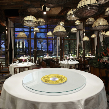 现代高端中式餐厅包间场景,深灰色圆形餐桌铺着质感细腻的深色桌布,摆放着精致的白色瓷盘、红色筷子、透明高脚杯和小巧的金色装饰球,周围环绕着黑色皮质餐椅,背景是深色墙面与带有横向线条的木质隔断,顶部柔和的嵌入式暖光照明营造出静谧优雅的氛围,整体风格简约奢华,色调以黑、灰、深棕为主,光影层次分明,展现出高级餐饮空间的精致与格调。