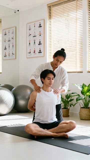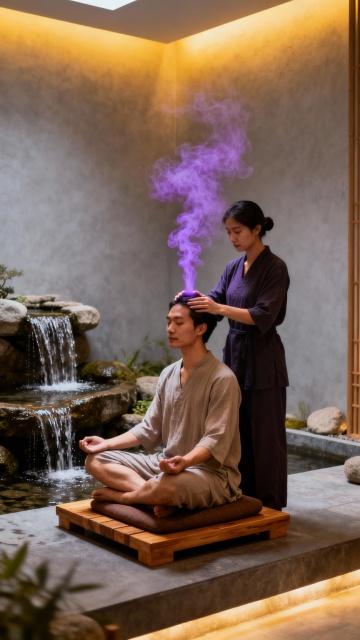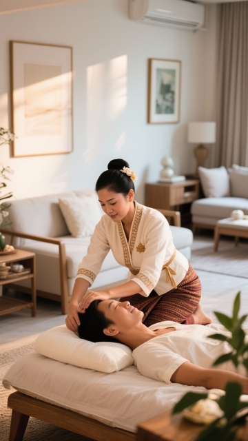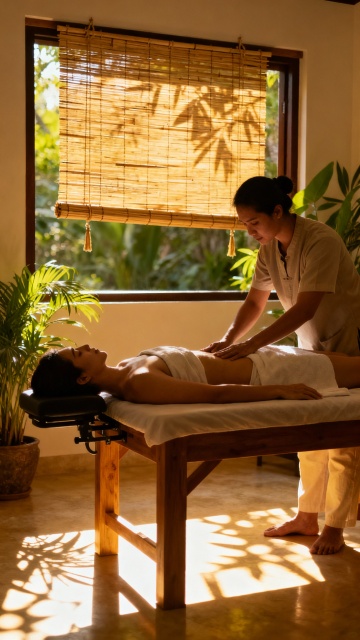 温暖柔和的自然光透过竹帘洒入,营造出宁静舒适的氛围。一位专业的按摩师正手持白色陶瓷小壶,将金黄色的按摩精油缓缓滴落在顾客的背部。顾客趴在铺着洁白毛巾的按摩床上,背部肌肤在阳光下泛着健康的光泽。背景是简约雅致的木质装饰和绿色植物,整体环境充满自然、放松的感觉,光线柔和温暖,突出精油滴落的瞬间和肌肤的质感,营造出高端SPA的舒适体验。