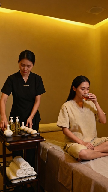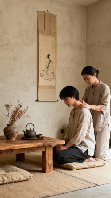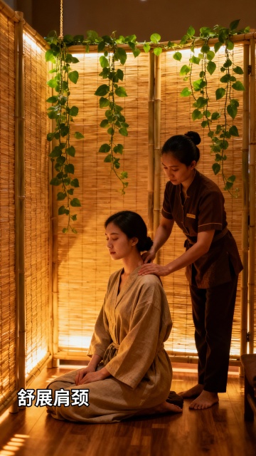 温暖柔和的自然光透过竹帘洒入,营造出宁静舒适的氛围。一位专业的按摩师正手持白色陶瓷小壶,将金黄色的按摩精油缓缓滴落在顾客的背部。顾客趴在铺着洁白毛巾的按摩床上,背部肌肤在阳光下泛着健康的光泽。背景是简约雅致的木质装饰和绿色植物,整体环境充满自然、放松的感觉,光线柔和温暖,突出精油滴落的瞬间和肌肤的质感,营造出高端SPA的舒适体验。