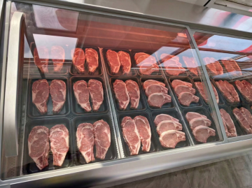 各种各样的肉类、蔬菜、水果用真空包装袋包裹着。横排整齐放置在桌子上。封口处的蓝色和厨师封条去除。