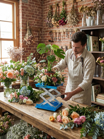 阳光充足的温室一角,一位植物学家利用桌子上的升降台,将一盆珍稀的兰花或小型盆景升高,以便从底部检查根系或进行拍摄。周围是茂盛的其他植物 比例3:4