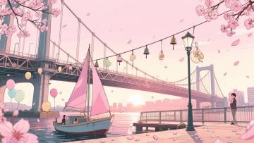 二次元日漫,城市海边,晚霞,约会,氛围浪漫、回忆,浅粉色,细节丰富,构图夸张,不要人物,16:9,生成二张