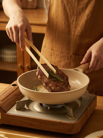展示动作:身着浅米色毛衣的人员,将带木质盖钮的高温容器(如烹饪锅具)放置在转盘上,转盘放置在白色大理石桌面上