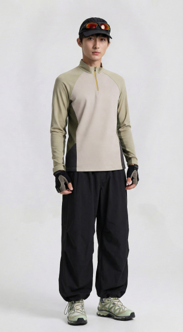 秋日氛围中,模特身着简约黑T与棕色工装裤,搭配自然光影与湖面倒影,展现都市休闲风与静谧感,融合时尚感与文艺气息。