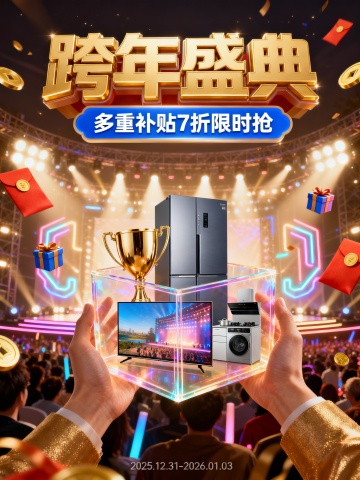 3D重拟物风格,鎏金宝箱盛满生活好物,搭配红金配色与节日元素,营造浓厚喜庆感与促销氛围,卡通化街景增添趣味,传递新年囤货季的温馨与欢愉。