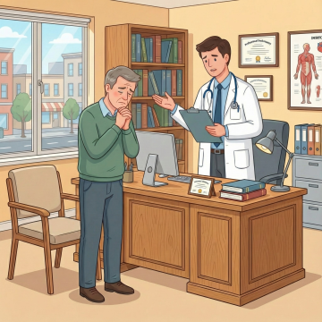 卡通风格医生形象,正面视角,男性,黑色短发,戴着圆形眼镜,面带微笑,身穿白色医生大褂,内搭蓝色衬衫和白色领带,脖子上挂着黑色听诊器,双臂交叉胸前,线条简洁流畅,色彩明快,以白色为主体,蓝色点缀,扁平化设计,无背景,整体风格友好亲切,充满职业感。