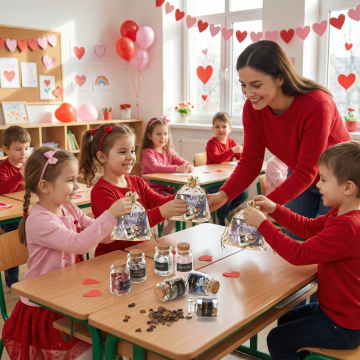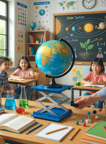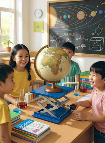 小学科学教室,升降台上放置一个地球仪,老师的手正在调整高度向学生展示,周围有化学烧杯、书本,背景黑板有粉笔画,阳光明媚的教室,生动活泼的教育场景 比例3:4