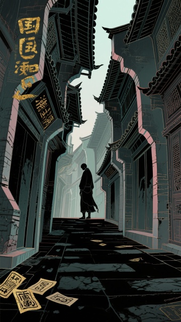 国潮风插画,中式古建筑剪影交织,鎏金符文悬空,水墨晕染夜色,一人静坐巷口,神秘沉郁中透出故事感。