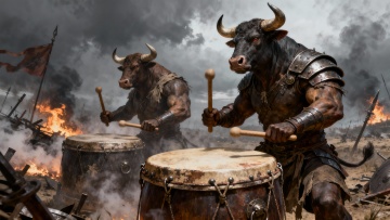 赛博朋克风3D机械牛头,金属质感融合霓虹电路,未来科技感十足,背景数据流与上升箭头象征AI金融趋势,酷炫视觉冲击力强。