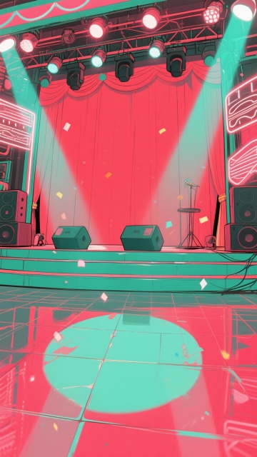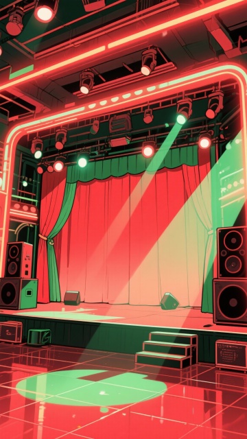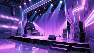 舞台设计,具有未来感和科技感的音乐表演舞台,舞台中央有黑色麦克风支架和麦克风,舞台地面由紫色发光方块地砖铺成,反射出明亮光泽,舞台背景是带有网格图案的深紫色墙面,两侧矗立着巨大的白色音响设备,音响上有圆形扬声器图案,舞台后方有蓝色透光玻璃窗,窗内隐约可见三个人影剪影,整体空间采用紫色和蓝色为主色调,搭配深色网格元素,灯光从上方投射出聚焦光束,营造出夜晚音乐演出的动感与神秘氛围,具有动漫风格的光影效果和清晰的线条轮廓,舞台两侧有对称的灯光装置,地面反光强烈,整体设计呈现出时尚、现代的视觉美感。