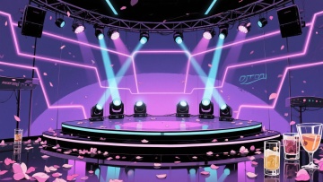 3D渲染的舞台场景,深邃宇宙星空背景,舞台以圆形多层台阶设计为主,配备现代感金属结构框架,顶部悬挂多盏聚光灯投射出蓝紫色与粉色交织的强烈光束,舞台中央有黑色音响和麦克风支架,两侧装饰有绿植和大型音响设备,整体呈现出科技感与梦幻氛围结合的音乐表演舞台,灯光璀璨,光影层次丰富,色彩以紫、粉、蓝为主色调,带有霓虹般的渐变效果,舞台地面光滑反光,背景点缀闪烁星点和几何线条装饰,营造出沉浸式演唱会现场的热闹与华丽感。