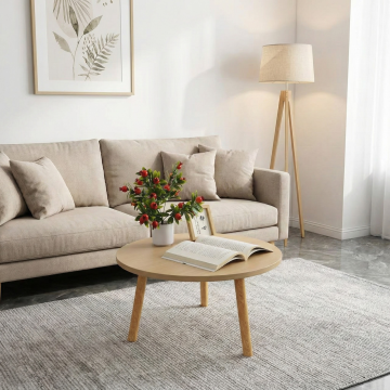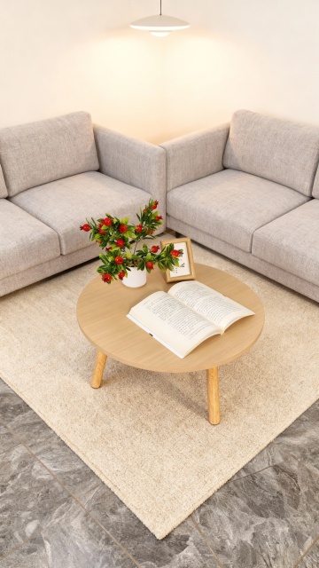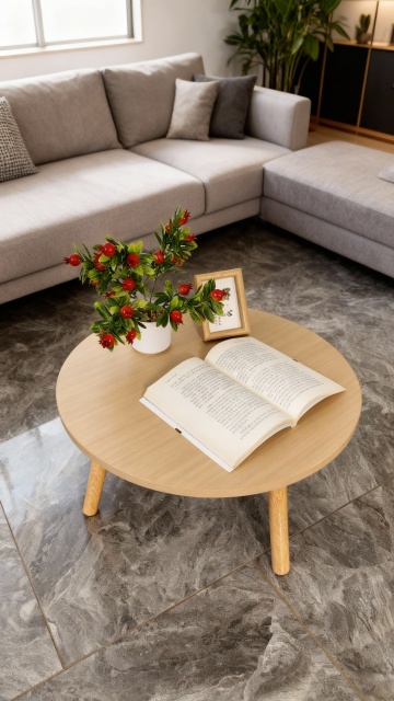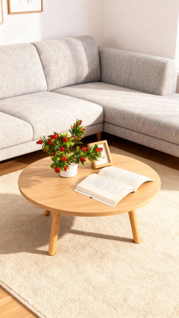 明亮温馨的室内场景,柔和的暖米色与白色为主色调,阳光透过百叶窗在浅木色地板和家具上投下清晰的水平光影条纹,营造出宁静舒适的氛围。画面中心是一张圆形白色茶几,边缘光滑,质感温润,桌面上可放置一本翻开的书和一个简约的陶瓷花瓶,插着几支新鲜绿植。茶几后方是一张浅灰色布艺沙发,线条简洁,靠背上随意搭着一条米白色针织毯。沙发旁边立着一盆枝叶舒展的绿色植物,叶片饱满有光泽。背景墙采用浅色竖条纹墙纸,搭配米色落地窗帘,窗帘半开,露出部分百叶窗。整体构图采用从茶几斜上方45度角俯拍的视角,突出桌面光影和前方物体,背景沙发和植物稍显虚化,形成自然的景深效果,光线柔和均匀,阴影过渡自然,整体风格偏向现代简约的家居设计,具有清晰的视觉层次和舒适的生活气息。