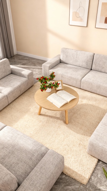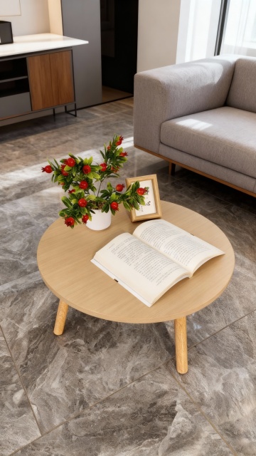客厅场景摆放着桌子,桌上摆放些装饰品,桌子摆放要与空间搭配