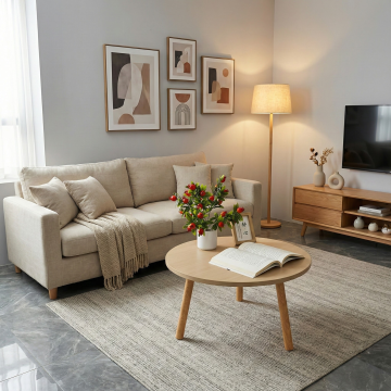 俯视角构图,一座充满侘寂美学的日式客厅,浅灰色亚麻布艺转角沙发搭配三个深棕色棉麻靠垫,沙发前铺设着带有自然纹理的浅橡木色低矮茶几,茶几上静置着一个粗陶花瓶,插着两枝干枯的芦苇。左侧墙面悬挂着三幅无框水墨挂画,右侧立着一个原木色梯形置物架,摆放着几个手工陶瓷器皿。自然光从右侧木质格栅推拉门温柔渗入,在深灰色微水泥地面上投下斑驳的光影,墙角处一盆琴叶榕舒展着宽大叶片,置于粗陶花器中。天花板悬挂着一盏纸灯笼造型吊灯,整体色调以原木色、浅灰和米白为主,营造出宁静质朴、岁月静好的氛围,细节处彰显自然材质的肌理之美。