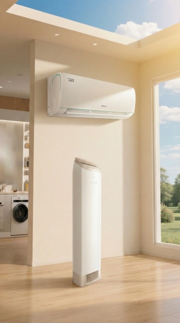 一张空调产品的商业摄影图片,展示一台立式圆柱形空调,纯白色机身,正面有黑色竖条形出风口,顶部和底部有银色金属装饰圈,机身顶部有品牌标志区域,整体采用简约现代的设计风格,高清晰度,光滑的塑料和金属质感,正面视角,居中构图,纯白色背景,柔和均匀的无影光源,突出产品的线条感和材质细节,专业的产品展示效果。