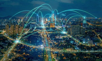 科技感抽象背景,以蓝色为主色调,白色为背景,由大量发光的点和线构成,线条呈现出流畅的波浪形态,部分线条向上延伸形成细长的光柱,整体画面简洁、现代,充满未来感和科技感。