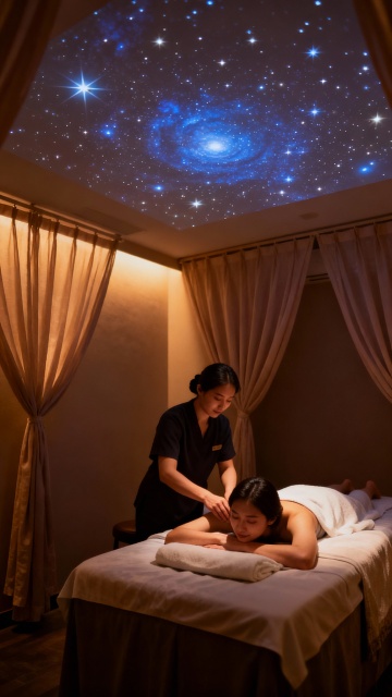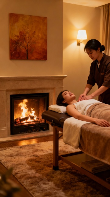 轻拟物风融合油画质感,柔和光影勾勒温馨按摩场景,实景感十足,传递舒适疗愈氛围。