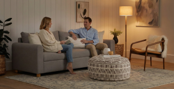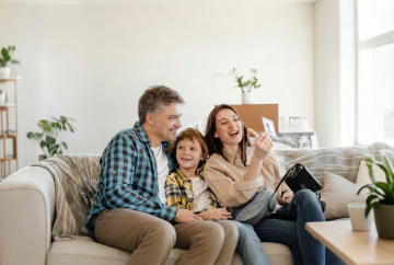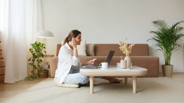 现代温馨家庭场景,一位25岁的孕妇坐在客厅地毯上看书,身穿米色长袖,双手拿着展开的书籍近距离看,眼睛视线对齐书籍,亚洲女性。旁边儿童在地上玩耍,大落地窗连接城市远景。屋内光线柔和,空气中弥漫着淡淡的蜜糖水甜味,营造出宁静、温馨、充满爱意的氛围