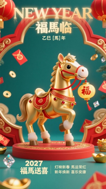2026年马年元旦视觉创意海报,居中对称式构图严格遵循黄金比例1:1.618,8K超高清细节。主体为一匹姿态优雅的彩金色骏马跑的姿势,骏马采用传统中国工笔画风格与现代3D立体效果相结合,鬃毛飘逸,眼神炯炯有神,身上装饰传统云纹和花卉图案,身边围着祥云。马大只。背景采用渐变的淡红色到淡黄色,背景有古风国花牡丹和祥云,营造浓厚的节日氛围。两侧对称分布着传统的红色灯笼和中国结。中央位置醒目展示“2026”立体艺术字,采用鎏金效果,“2026”下面是“元旦快乐”四个古典书法字体,使用粗体毛笔书法字体,字体鎏金效果,文字具有明显的毛笔笔触质感,边缘有自然的飞白效果,文字笔画有微妙的变化。底部手写体白色小字“-2026 马到福来·奔向美好未来-”。整体设计运用美学三大构成原理:平面构成上点线面层次分明,色彩构成上红金对比和谐,立体构成上营造出强烈的空间层次感。细节处理精致入微,包括骏马的每一根鬃毛、烟花的每一缕光芒、灯笼的纹理质感都清晰可见。商业级印刷品质,适合高端宣传推广使用。