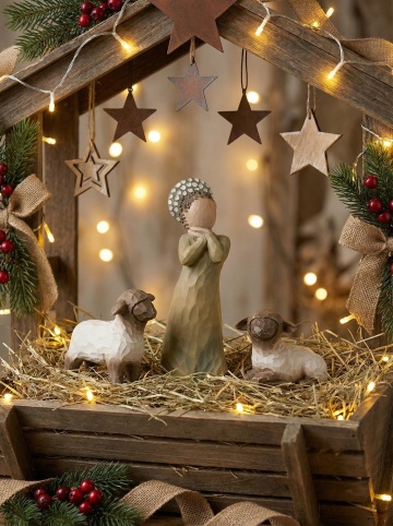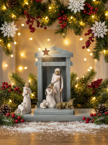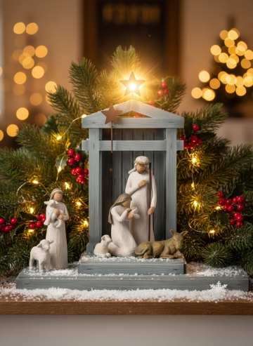 暖光烛火映衬雪覆松枝,微缩圣诞树与松果静置木台,油画质感融汇浮雕层次,重拟物风呈现温馨舒适实景,营造冬夜沉浸式节日氛围。