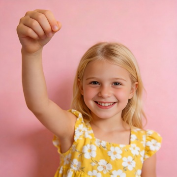 明亮的纯橙色背景,一个穿着白色镂空花纹衬衫和米色条纹背带裙的小女孩,脖子上系着一条绿色底印有白色雏菊和橙色小花图案的丝巾,她微微歪着头,睁大眼睛,嘴角上扬,露出开心的笑容,眼神中带着一丝俏皮和好奇,整体画面色彩明快,光线柔和,人物表情生动自然,具有清晰的肖像摄影风格。