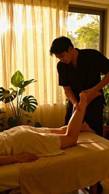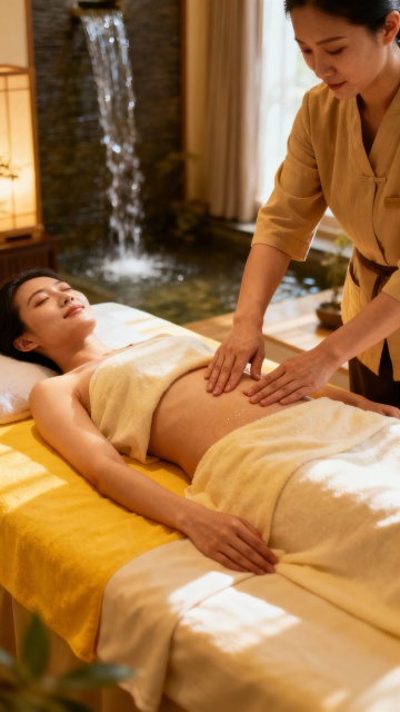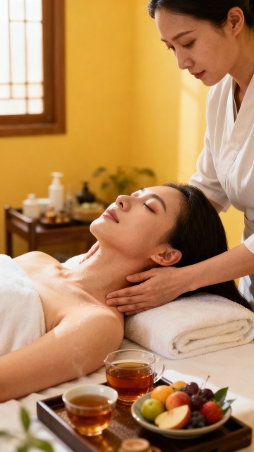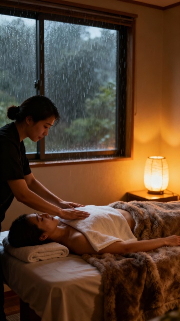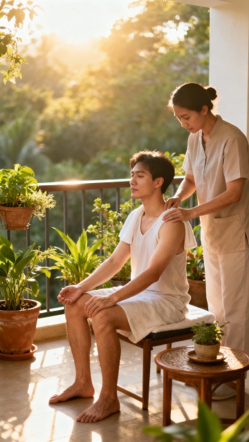 轻拟物风融合油画质感,柔和光影勾勒温馨按摩场景,实景感十足,传递舒适疗愈氛围。