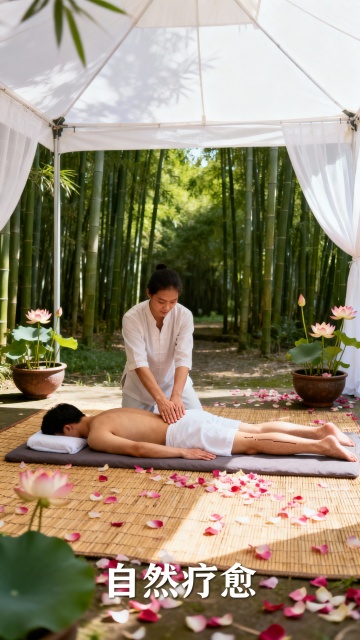 温暖柔和的自然光透过竹帘洒入,营造出宁静舒适的氛围。一位专业的按摩师正手持白色陶瓷小壶,将金黄色的按摩精油缓缓滴落在顾客的背部。顾客趴在铺着洁白毛巾的按摩床上,背部肌肤在阳光下泛着健康的光泽。背景是简约雅致的木质装饰和绿色植物,整体环境充满自然、放松的感觉,光线柔和温暖,突出精油滴落的瞬间和肌肤的质感,营造出高端SPA的舒适体验。