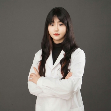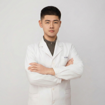一位亚洲女性医生的证件照,她穿着洁白挺括的医生白大褂,内搭浅蓝色衬衫,双臂自然交叉于胸前。她的头发梳理得整洁利落,露出光洁的额头和温和的面容,嘴角带着亲切自然的微笑,眼神明亮有神,充满专业与亲和力。背景为纯白色,光线均匀柔和,突出人物主体,整体画面简洁干净、专业正式,符合证件照的规范和职业形象。
