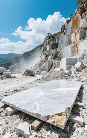 石材矿场开采的场景,场景中有蓝天白云。场景左下方放着岩板的特写照片